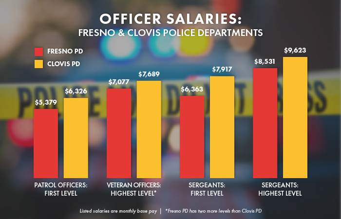 You need only to look at the salary gaps between Clovis and Fresno police officers to understand the challenge Chief Dyer faces. As the chart shows, Fresno’s pay for rookie patrol officers trails that of Clovis by 16.2%. A newly promoted sergeant in Clovis makes 21.8% more than his Fresno counterpart.