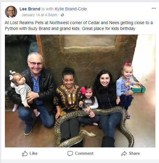 On January 14, Brand posted a Facebook family selfie with his grandchildren at Lost Realms Pets. On Monday, ABC 30 reported the unique “reptile superstore” has closed, less than a year after its grand opening.