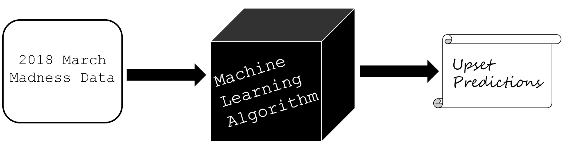 In machine learning, there are a variety of black boxes available. For our March Madness project, the ones we wanted are known as classification algorithms. These help us determine whether or not a game should be classified as an upset, either by providing the probability of an upset or by explicitly classifying a game as one.