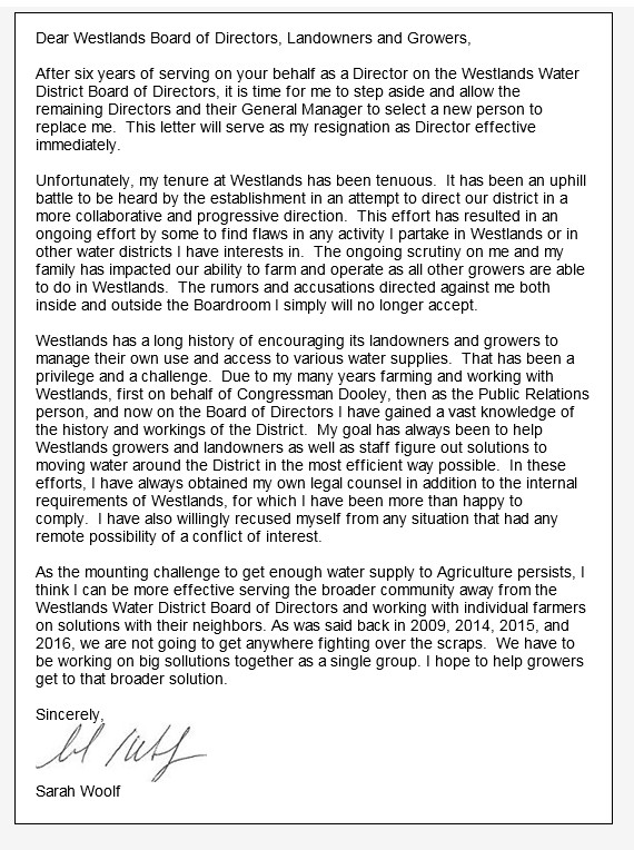 In the letter, Woolf also said that she could better advocate for agriculture “away from the Westlands Water District Board of Directors and working with individual farmers on solutions with their neighbors.”