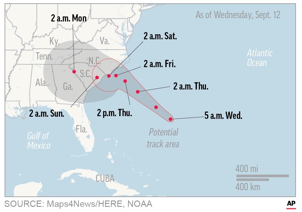 Florence is the most dangerous of three tropical systems in the Atlantic. Tropical Storm Isaac was expected to pass south of Puerto Rico, Haiti, the Dominican Republic and Cuba, while Hurricane Helene was moving northward away from land. Forecasters also were tracking two other disturbances.The coastal surge from Florence could leave the eastern tip of North Carolina under more than 9 feet of water in spots, projections showed. The Navy, Air Force and Army were moving ships and aircraft out of harm’s way. Thousands of Marines and their families evacuated from Camp Lejeune, leaving the rest to dig in ahead of what could be a direct hit.