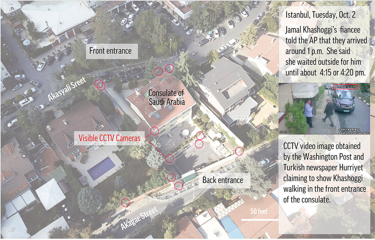 The footage all seemed to come from surveillance cameras, which would have been posted throughout the district housing the Saudi consulate and other diplomatic missions. No one has produced any such footage of Khashoggi leaving the consulate.