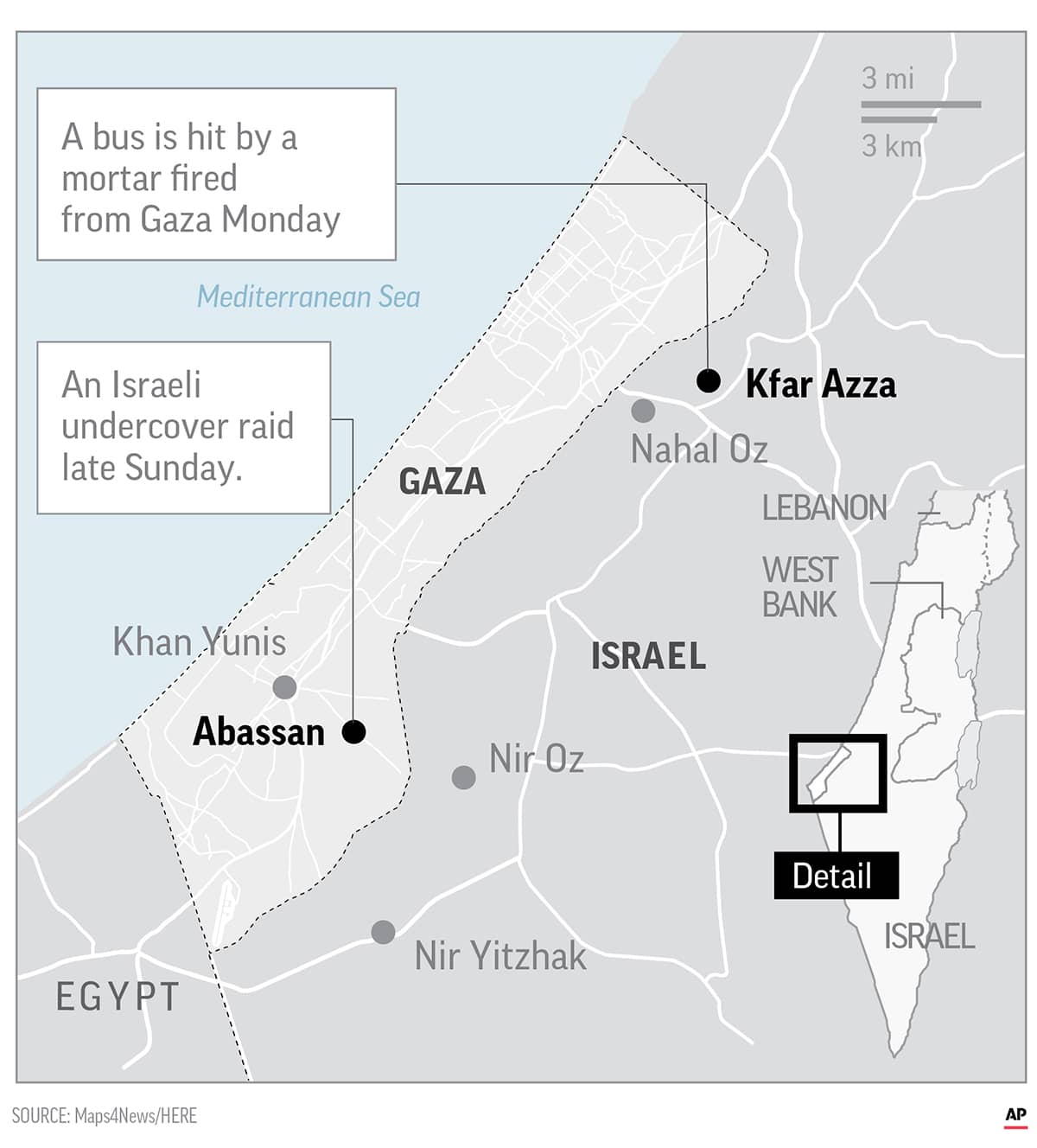 Palestinian officials said at least three people, including two militants, were killed by Israeli fire and nine were wounded. In Israel, the national rescue service said at least seven people were wounded, including a 19-year-old soldier who was in critical condition.