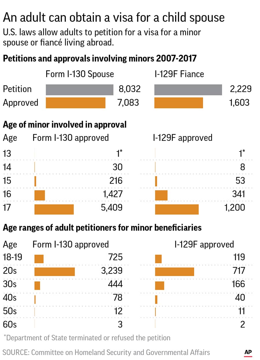 WASHINGTON — Thousands of requests by men to bring in child and adolescent brides to live in the United States were approved over the past decade, according to government data obtained by The Associated Press. In one case, a 49-year-old man applied for admission for a 15-year-old girl.
