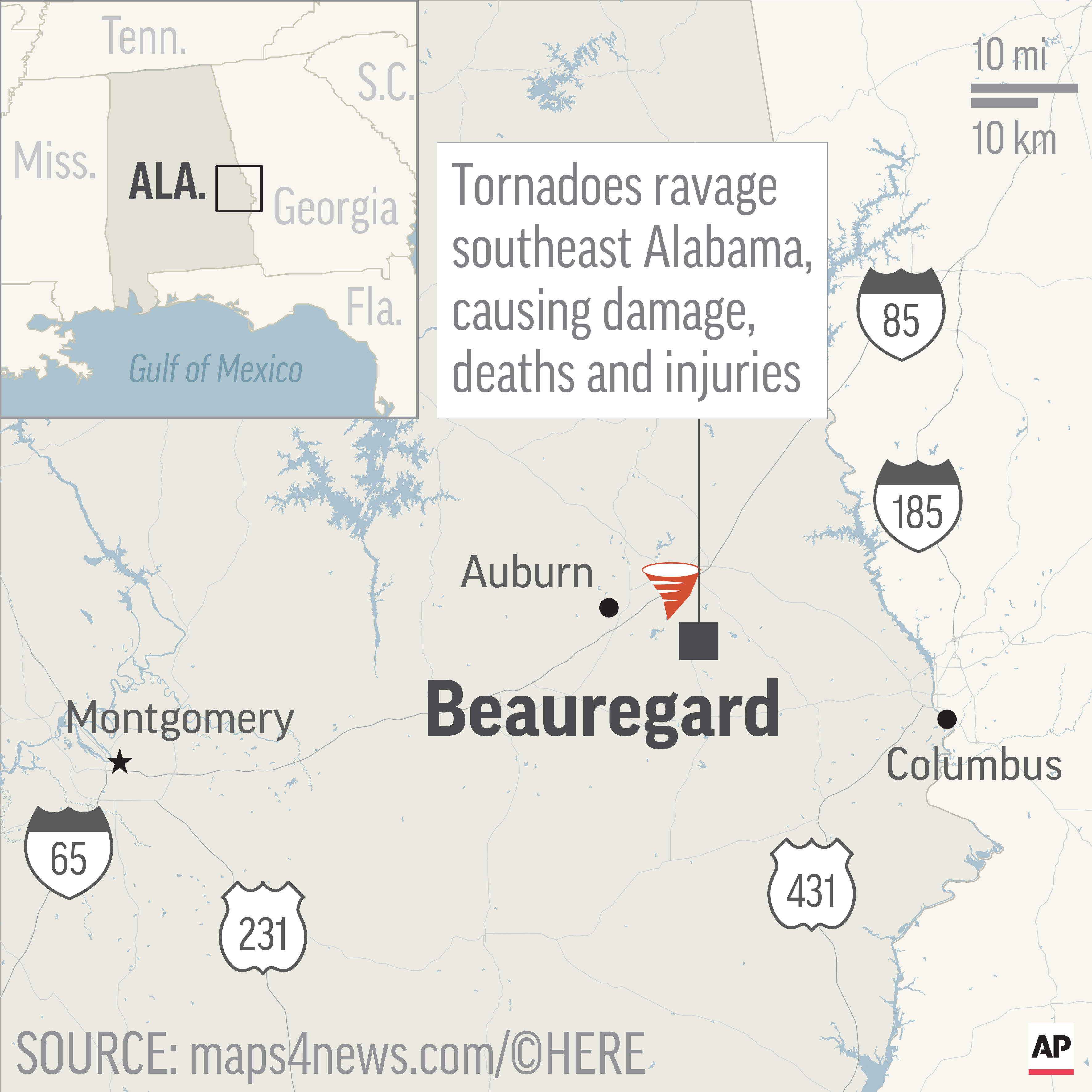 Jones said the twister traveled straight down a county road in the rural community of Beauregard and that the path of damage and destruction appeared at least a half mile wide. He said single-family homes and mobile homes were destroyed, adding some homes were reduced to slabs. He had told reporters earlier that several people were taken to hospitals, some with “very serious injuries.”