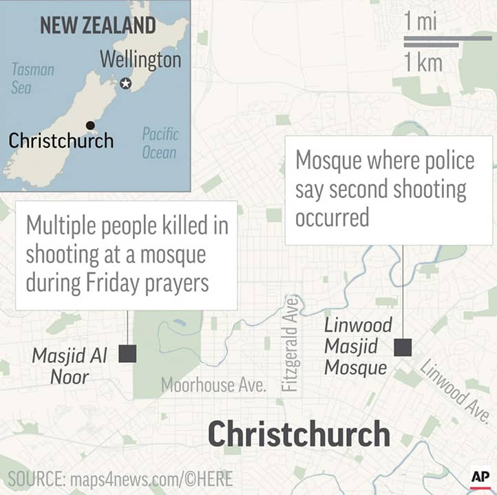 CHRISTCHURCH, New Zealand — At least 49 people were killed in mass shootings at two mosques full of worshippers attending Friday prayers in an attack broadcast in horrifying, live video by an immigrant-hating white supremacist wielding at least two assault rifles and a shotgun.