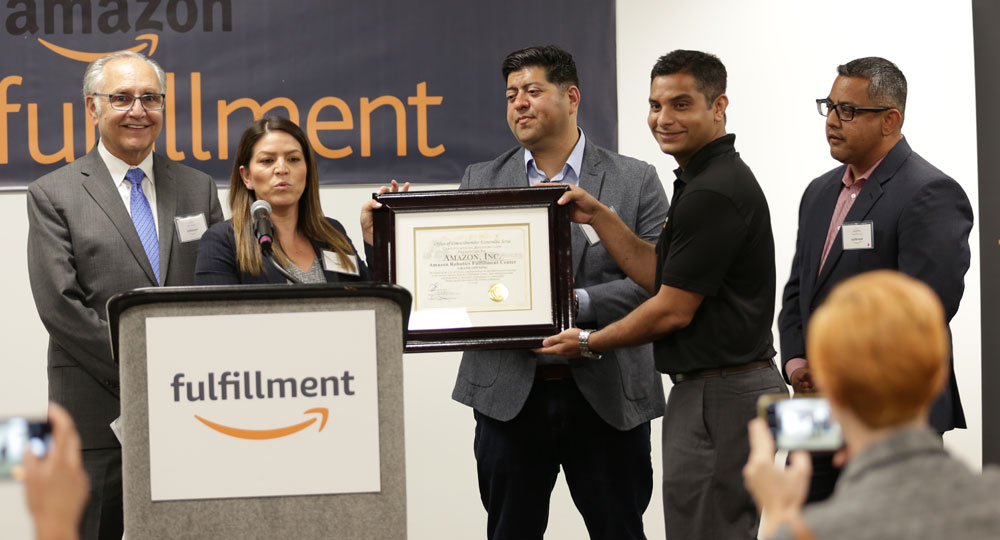 Marking the grand opening of the Amazon Fulfillment Center are, from left, Fresno Mayor Lee Brand, Fresno Councilwoman Esmeralda Soria, Councilman Luis Chavez, Fullfillment Center General Manager Ankush Pole, and Councilman Miguel Arias. (Jamie Ouverson/GV Wire)Pole said the scheduling of the grand opening more than a year after the center started operating is traditional for Amazon, which typically waits until its centers are up and fully operating before holding such events.