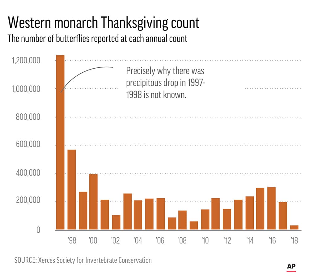 In the U.S. West, where monarchs spend the winter rather than migrate to Mexico, their numbers have plummeted from 4.5 million in the 1980s to fewer than 30,000 last winter.