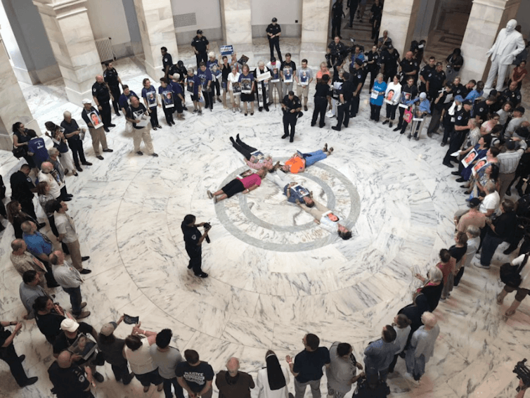 Holding pictures of migrant children who have died in U.S. custody and forming a cross with their bodies on the floor of the Russell Senate Office Building, 70 Catholics were arrested in July for obstructing a public place, which is considered a misdemeanor.