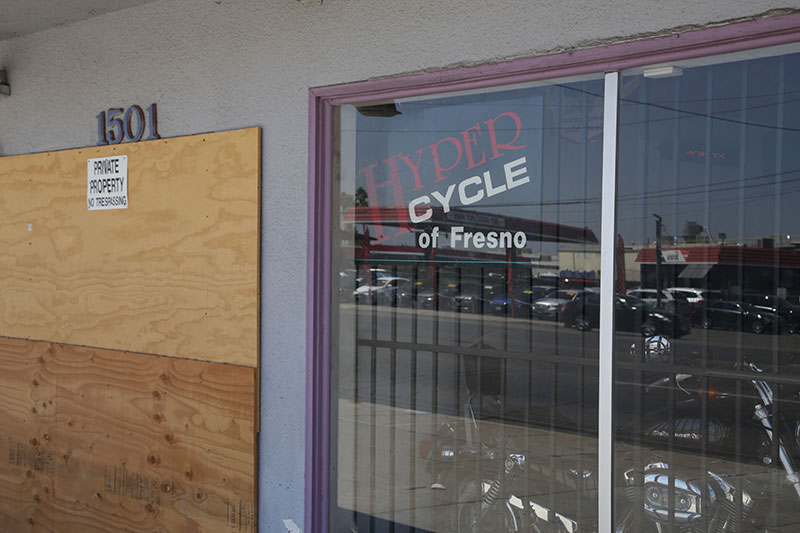 Hypercycles remains closed, even with a motorcycle in the display window. To the business’s left is Mid-Cal Engines & Transmissions. Neighbors say the owner closed up shop completely.