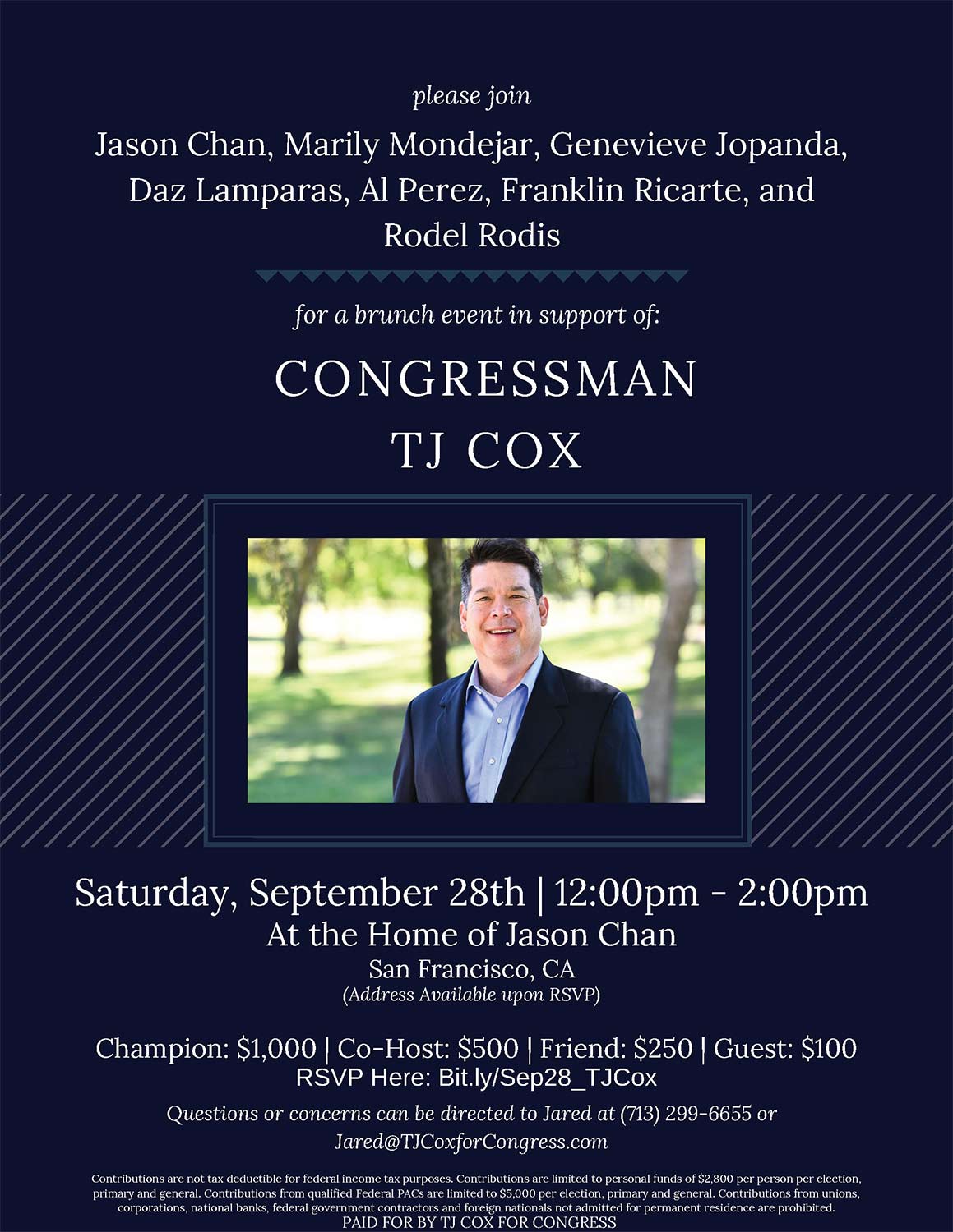 Cox, in a reelection contest rematch against David Valadao (R-Hanford), has another fundraiser scheduled Sept. 28 in San Francisco.