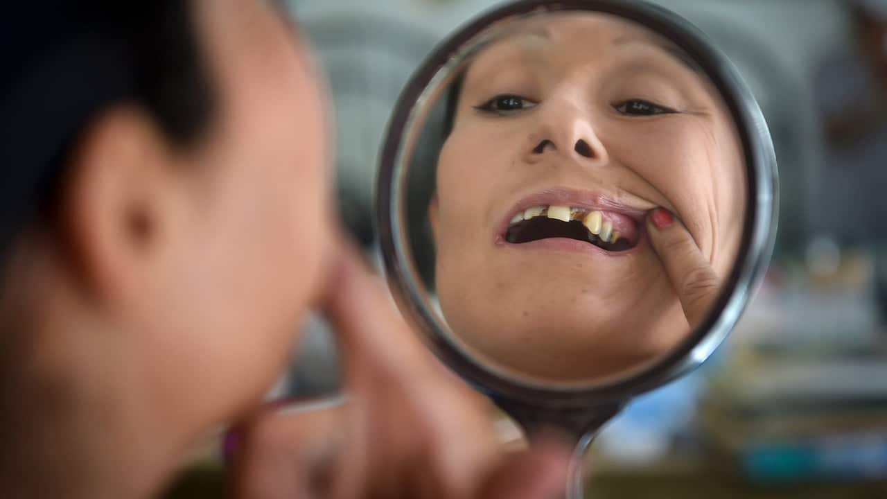Her teeth are yellow, crooked and browning around the corners. Most of her top teeth are either chipped, missing or decaying. When they fell out, they crumbled like chalk.
