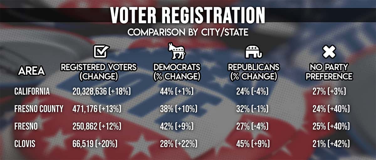 The trend is largely reflected locally as well. The state saw a 20% increase in registration compared to the same period prior to the 2016 presidential primary election. In Fresno County, there was a 13% increase.