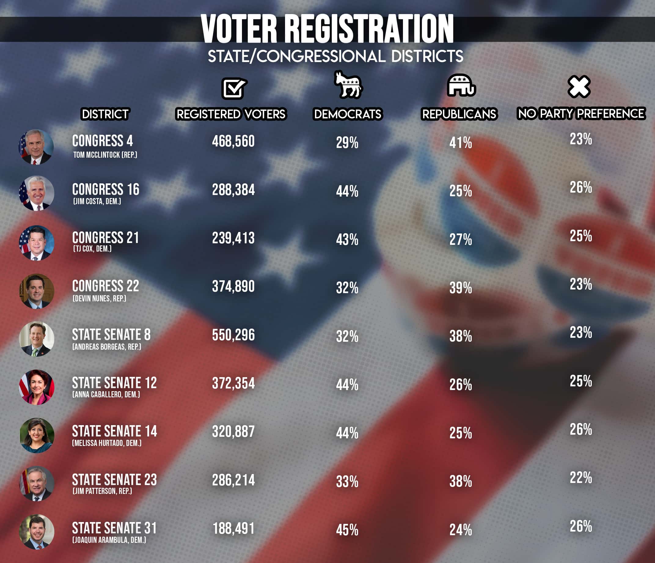 Of the four congressional seats, District 16 represented by Jim Costa (D-Fresno) has the most partisan support, with a 44%-25% Democrat-to-Republican advantage. In fact, there are more NPP voters (26%) than Republicans. Costa’s strongest challenger in the 2020 election is a fellow Democrat, Fresno Councilwoman Esmeralda Soria.