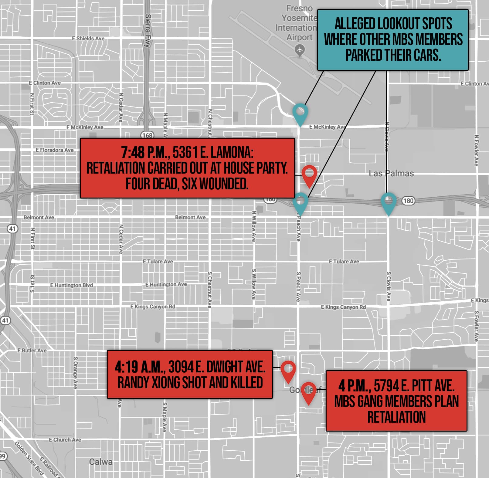 According to the DA complaint, Lee rode with Johnny Xiong, and positioned themselves at McKinley and Peach avenues. This information conflicts with information in the federal complaint that said Xiong was stationed at an AM/PM gas station at Clovis and Olive avenues, and had his wife in the car.