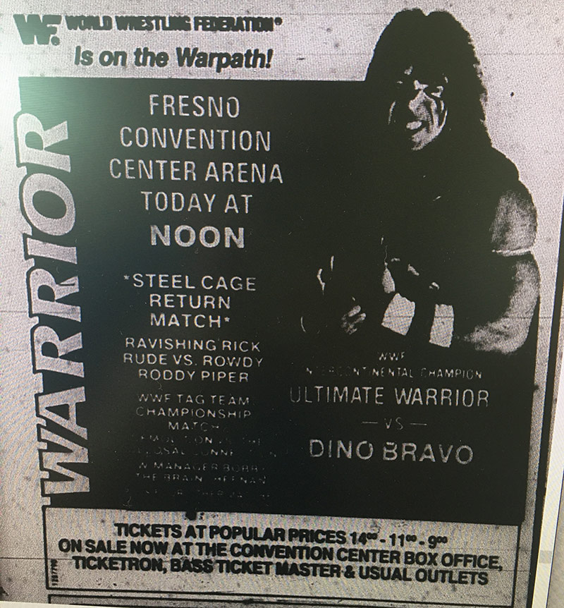 However, a look at an ad in The Fresno Bee stated that this was a “steel cage return match.” As in, Piper vs. Rude was a return match. As in, Piper had already come back to Fresno.