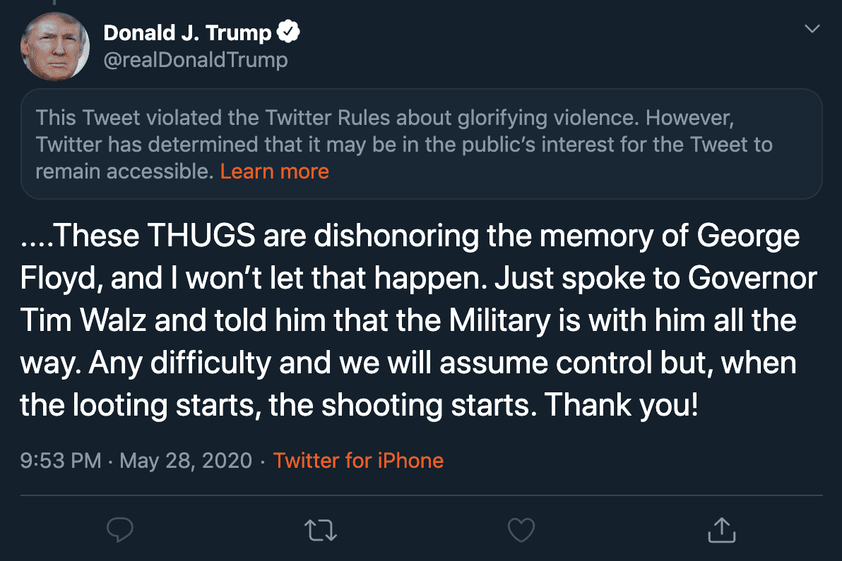 “These THUGS are dishonoring the memory of George Floyd, and I won’t let that happen,” Trump tweeted about the protesters. “Just spoke to Governor Tim Walz and told him that the Military is with him all the way. Any difficulty and we will assume control but, when the looting starts, the shooting starts. Thank you!”