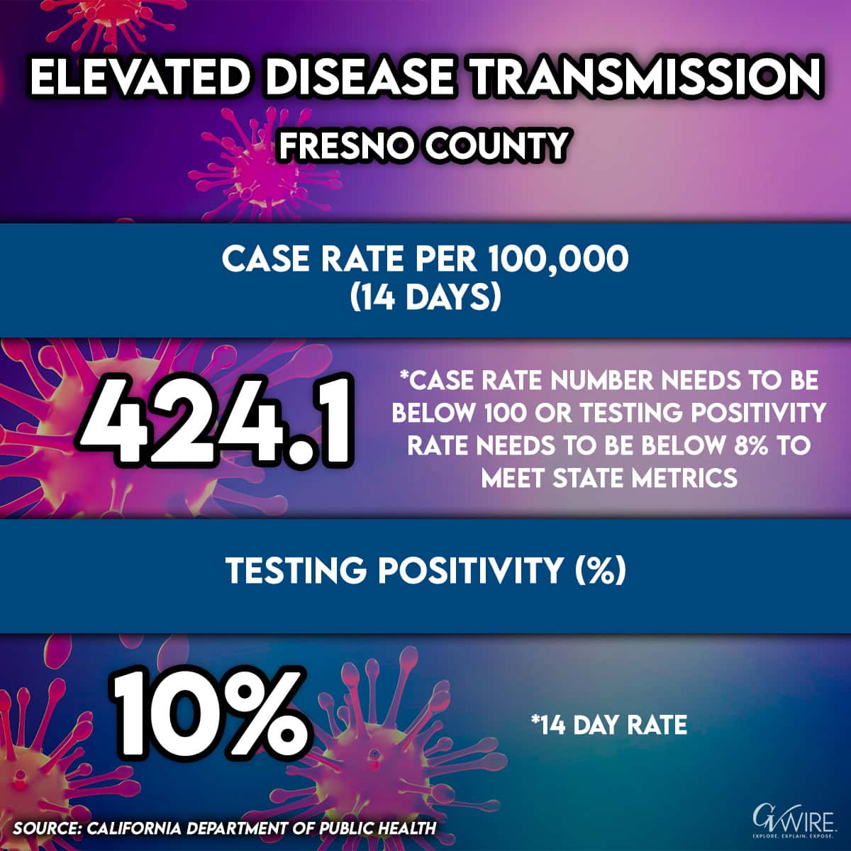 The California Department of Public Health tells GV Wire℠ in an email: “Counties need to be meeting threshold (above or below what is set for each metric) for all metrics, for three consecutive days before a county is removed.”