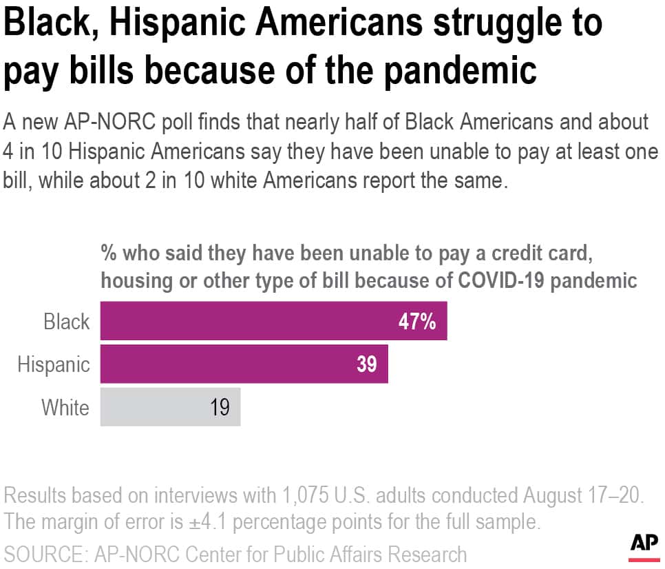 About half of Black Americans and roughly 4 in 10 Hispanic Americans say they’ve been unable to pay a bill, compared with about 2 in 10 white Americans. And 66% of Hispanic Americans say they’ve experienced household income loss, compared with 50% of Black Americans and 44% of white Americans.