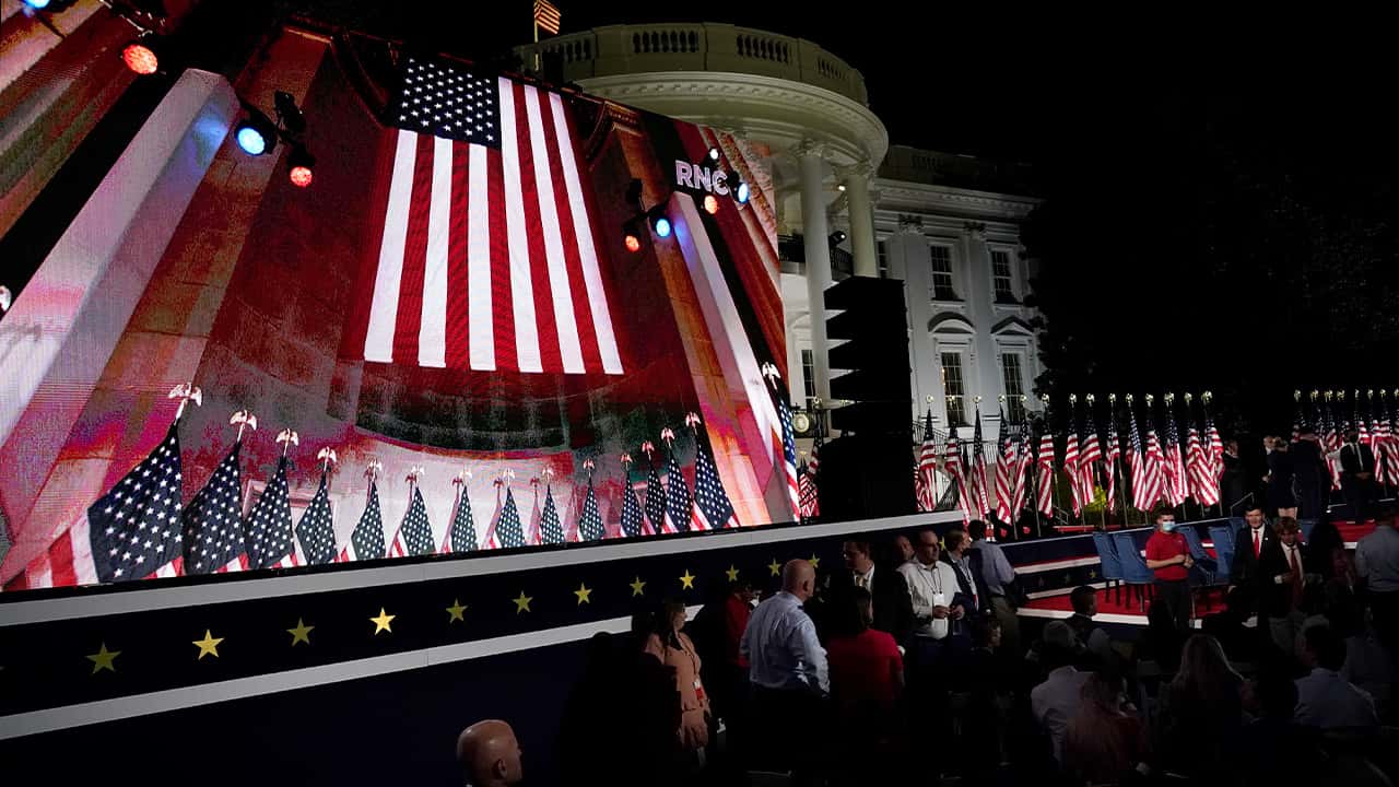 The president spoke from a setting that was both familiar and controversial. Despite tradition and regulation to not use the White House for purely political events, a huge stage was set up outside the executive mansion, dwarfing the trappings for some of the most important moments of past presidencies. The speaker’s stand was flanked by dozens of American flags and two large video screens.
