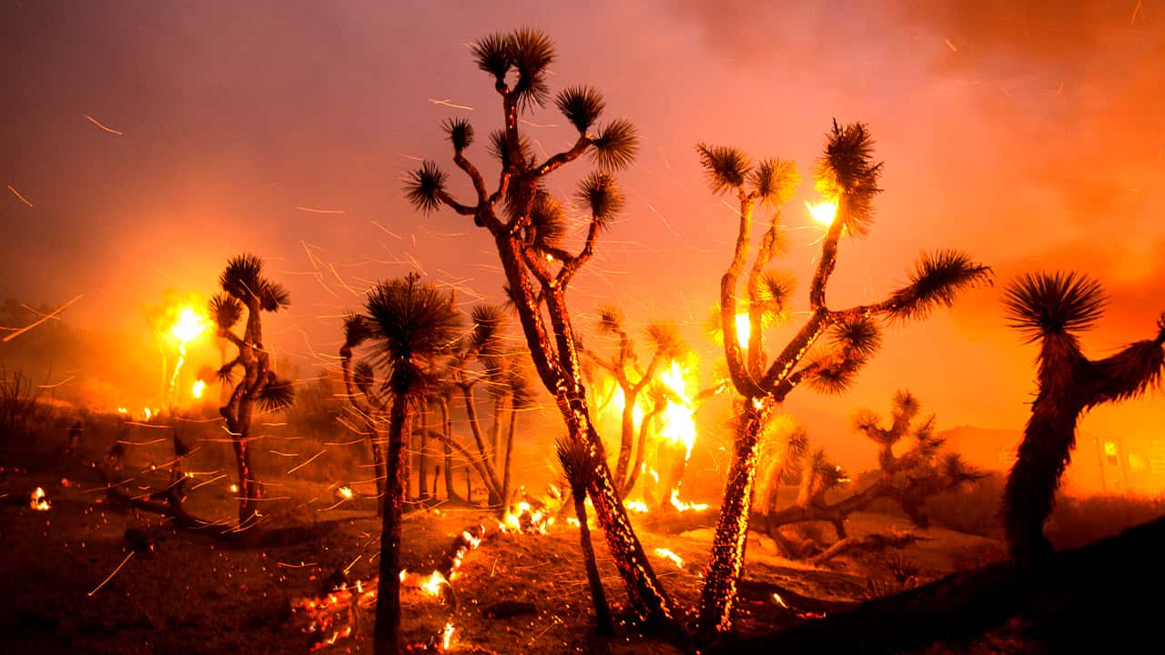 JUNIPER HILLS — An enormous wildfire that churned through mountains northeast of Los Angeles and into the Mojave Desert was still threatening homes on Monday, but officials said calmer winds could help crews corral the flames.