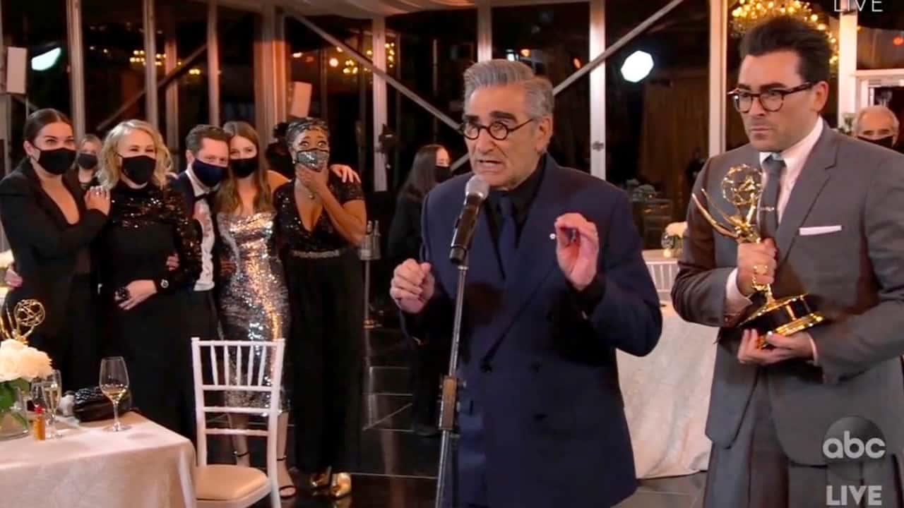Levy used some of his considerable mic time to urge viewers to vote in November. Noting that his show was “at its core about the transformational effects of love and acceptance,” he urged people to “go out and vote because that is the only way that we are going to have love and acceptance out there.” Of course, he wasn’t the only one: King, when she won for HBO’s ”Watchmen,” reminded watchers: “Have a voting plan, go to ballotpedia.com, vote up the ballot, please. Also stressing the importance of the vote: Mark Ruffalo, a winner for “I Know This Much Is True.”