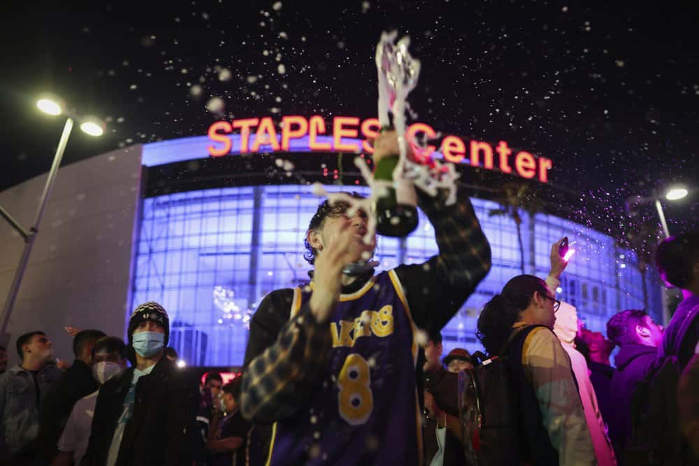 The sounds of fireworks immediately reverberated across Los Angeles and fans headed to Staples Center, the Lakers’ home court, to celebrate — despite admonitions to stay away.