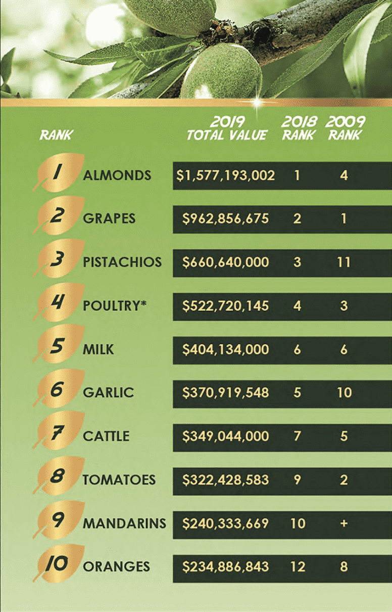 Almonds are the top commodity in the county in value, at $1.5 billion. Grapes were second at $962 million, followed by pistachios at $660 million. More than 78 crops had a value more than $1 million.