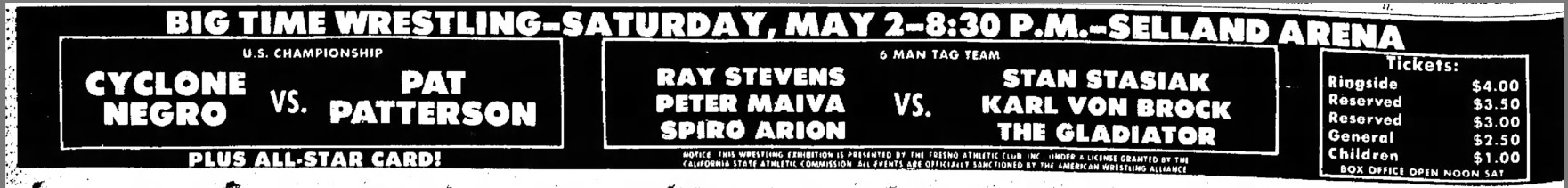 A search of Fresno Bee archives of that year show only one newspaper advertisement. Sure enough, Patterson headlined the show, defending the United States championship against Cyclone Negro.