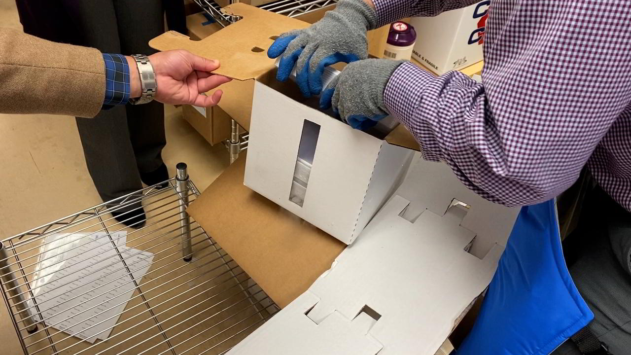 Prado says each box weighs about 70 or 80 pounds because of all the vaccine and dry ice packed into each one.