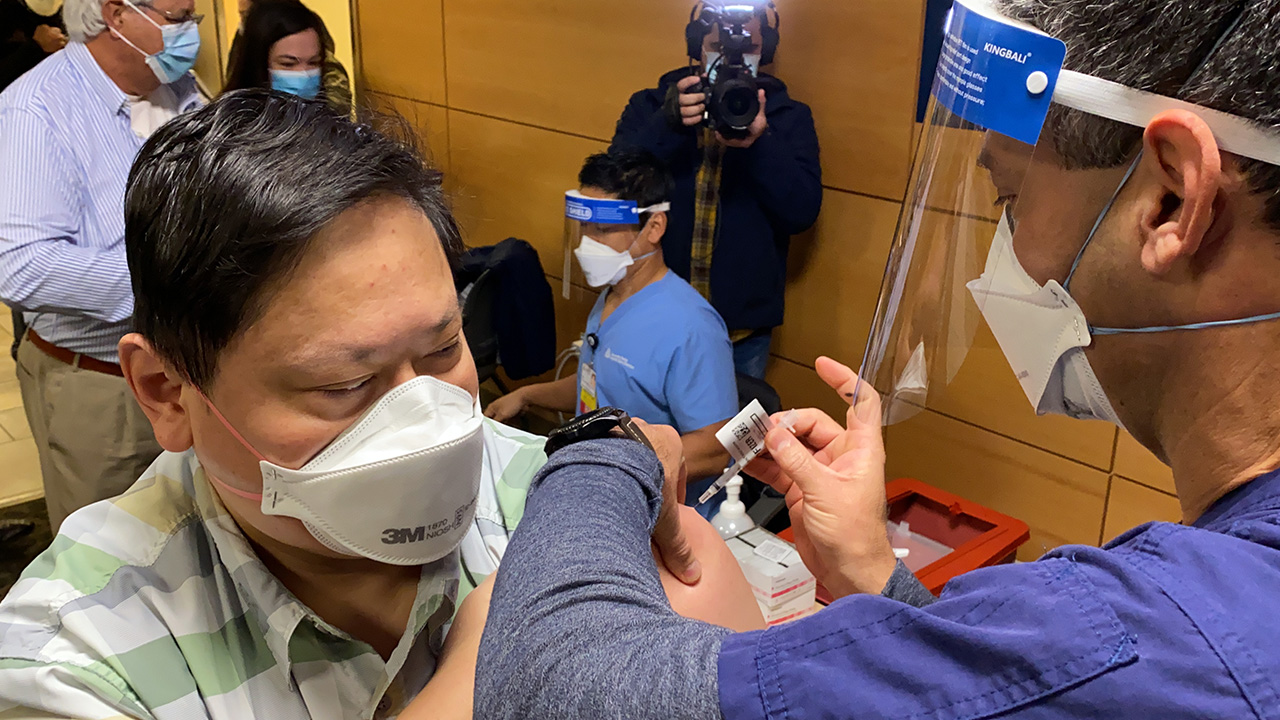 Dr. Wally Huynh, an internal medicine physician who has cared for an estimated 150 COVID patients, was the first to be vaccinated. The second to get vaccinated was Johnny Mata, Jr. a respiratory therapist.