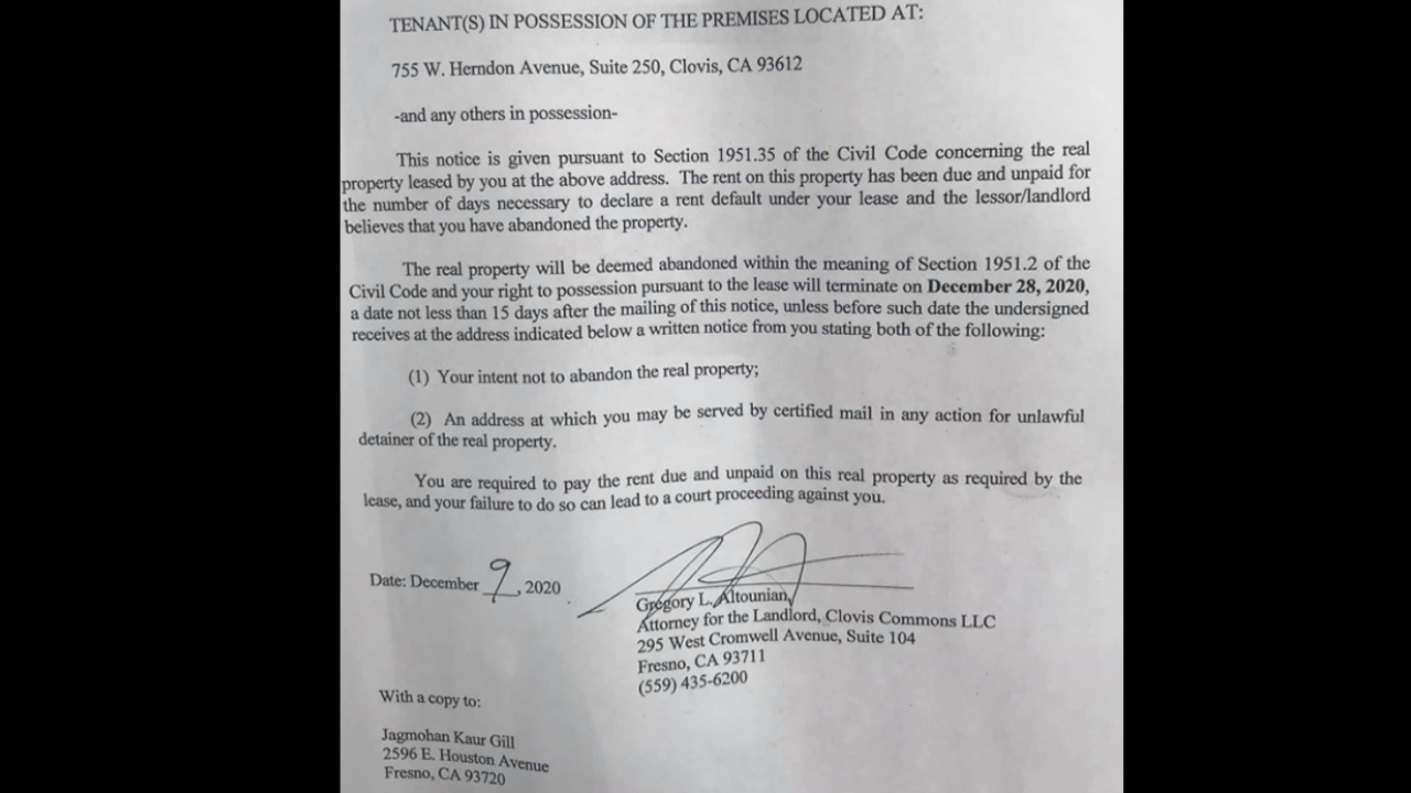 The notice taped to the front door of Gill’s business reads in part: “The rent on this property has been due and unpaid for the number of days necessary to declare a rent default under your lease and the lessor/landlord believes that you have abandoned the property.”
