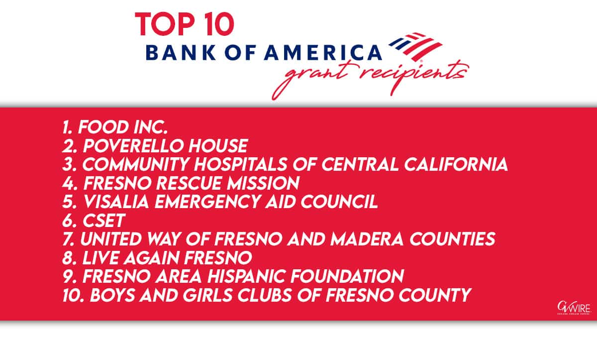 In 2019, Charlotte, N.C.-based Bank of America granted $500,000 to nonprofits and communities in Fresno, Tulare, and Merced counties.