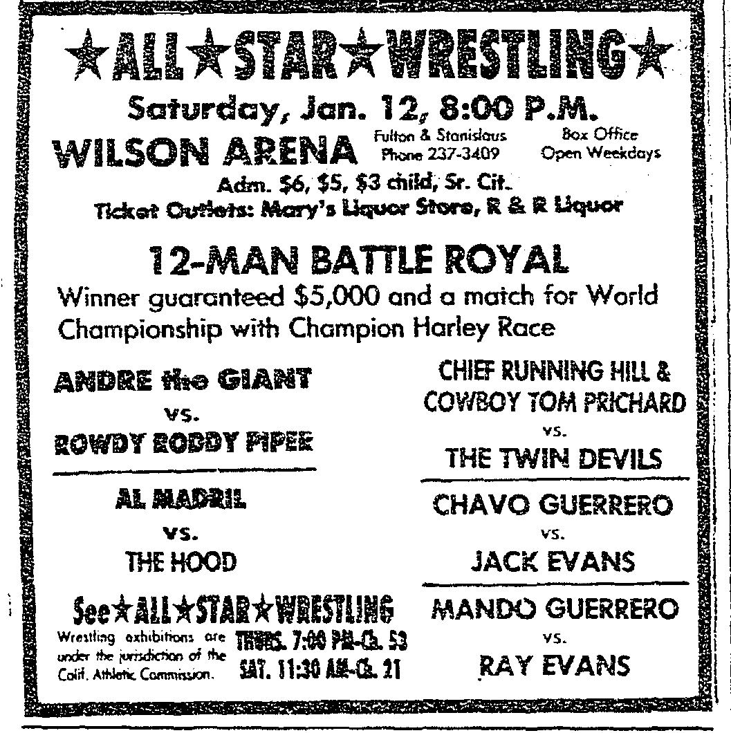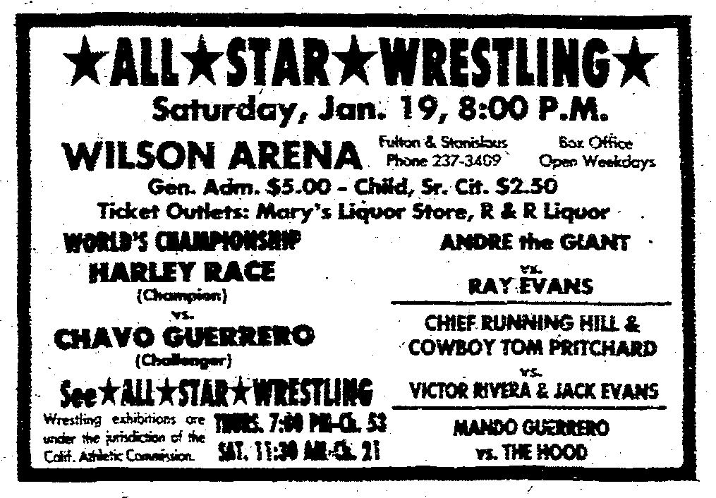 Starting in 1979, the longtime boxing promoter held weekly cards at the Wilson Theater in downtown Fresno, dubbed the Wilson Arena for ring events. He imported talent from the Hollywood Wrestling Office, the NWA affiliate that promoted out the Olympic Auditorium in Los Angeles.