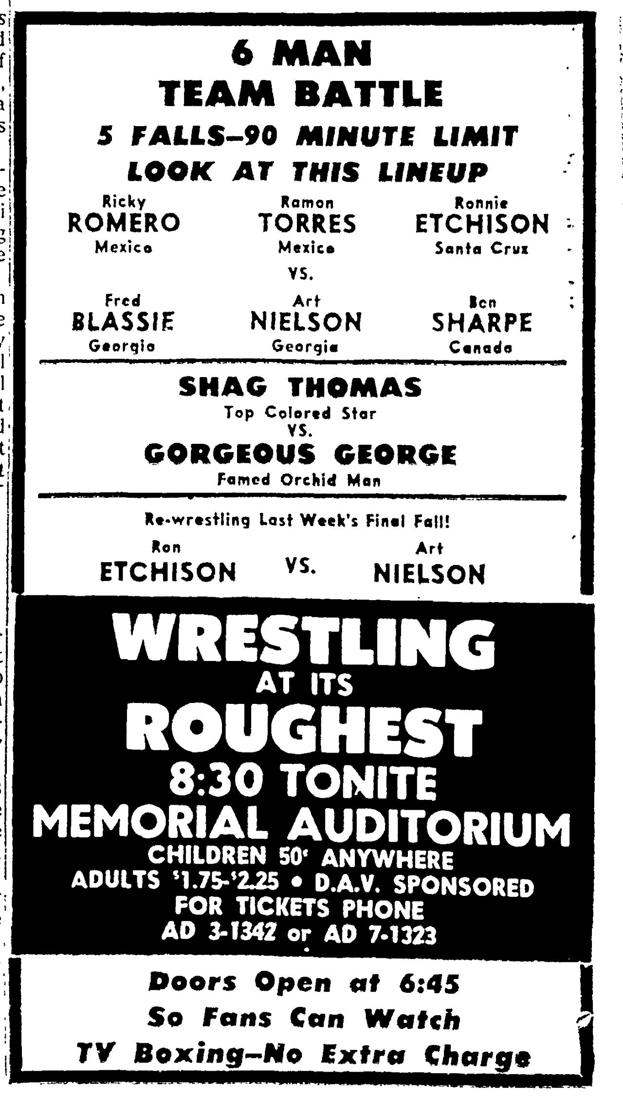 Gorgeous George, real name George Wagner, made his final appearance in Fresno later that summer. He died in 1963 at the age of 48.
