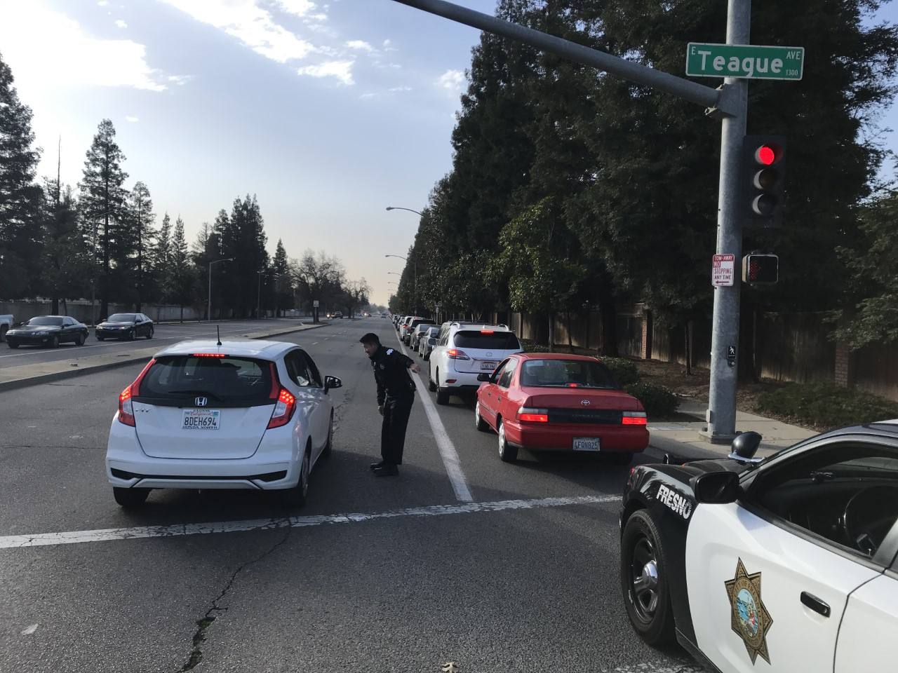 A long line of cars was idling on the southbound curb lane but hadn’t turned west onto Teague Avenue as Sierra Pacific and Fresno police had agreed for the new traffic pattern that started Tuesday.