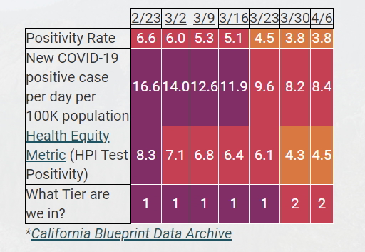 The California Department of Public Health announced they’ve now administered more than 20 million vaccine doses, including 4 million in the state’s hardest-hit communities. The accomplishment triggered a loosening of the metrics required for individual counties to move through the state’s color-coded tier system.