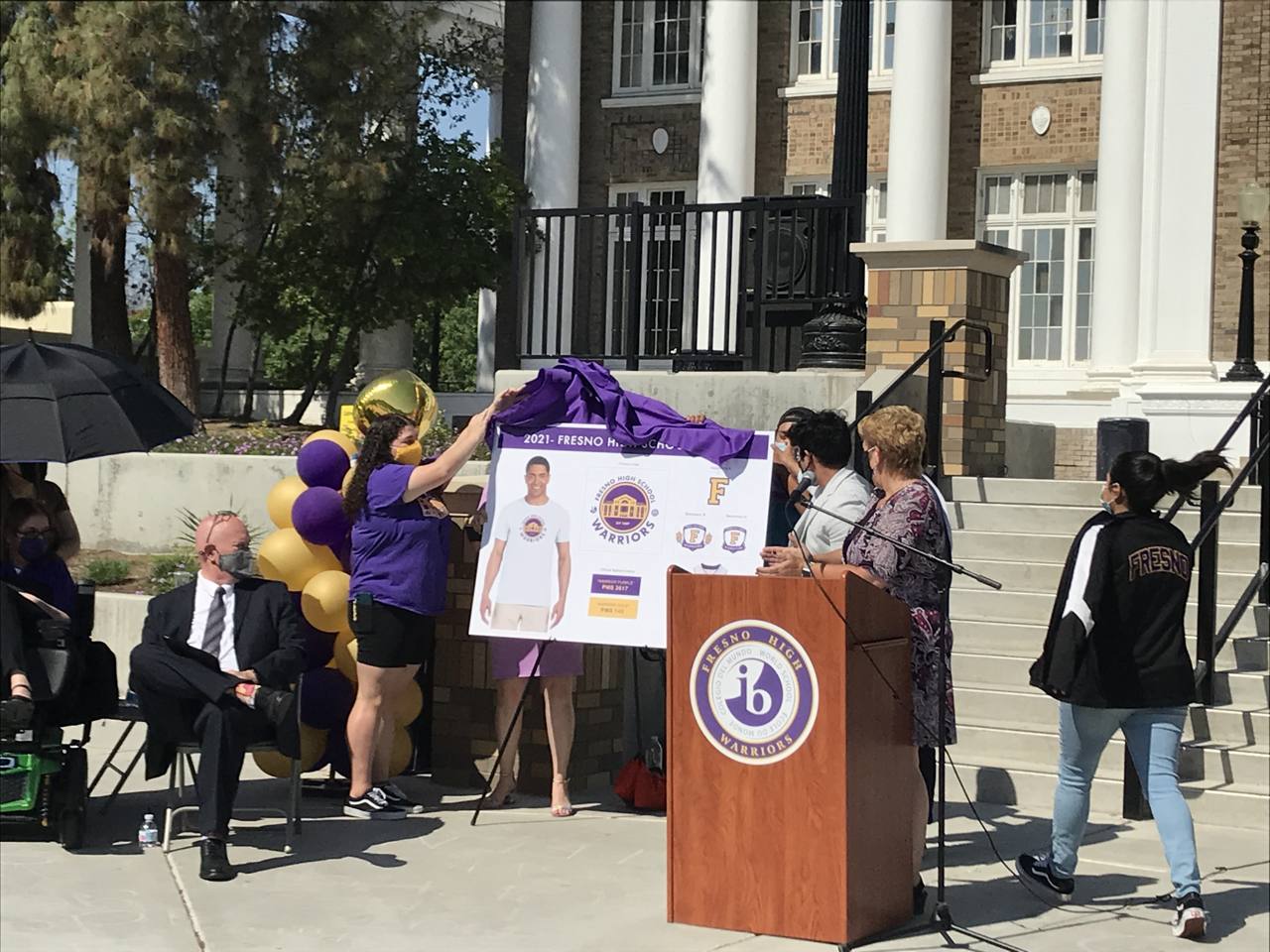“When voting was complete, we had two images that were separated by two votes. Both images represented the strength and history that is Fresno High and our Warrior community, so we decided to incorporate both,” she said prior to the unveiling. “This morning we will unveil our new Warrior logo, along with the second image that will serve as a complementary athletic image.”
