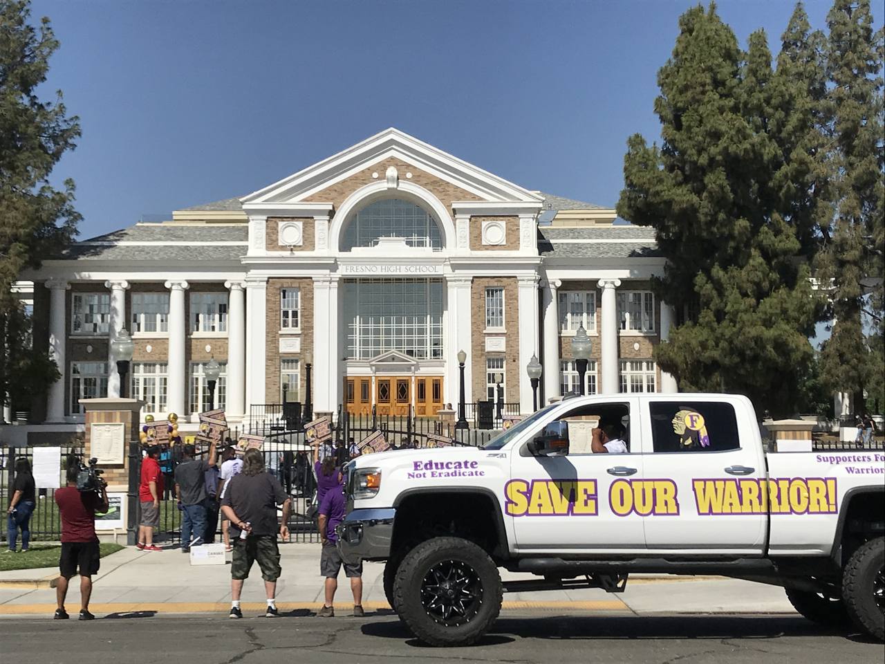 Rector joined other placard-bearing protesters on the street side of the iron gates that mark the entrance to the Fresno High campus. Their shouts during the short unveiling ceremony at times nearly overpowered the speeches being amplified by the public address system.