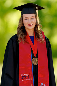Amanda Skidmore, Jordan College of Agricultural Sciences and Technology: Skidmore, of Atwater, is a double major who completed her B.S. in business administration, marketing emphasis, and her B.S. in agricultural business with a 3.9 GPA. Skidmore spent the last four years building relationships through internships. She interned at the California Cotton Ginners and Growers as a freshman, then went on to Zenith Insurance Company. She was a marketing intern at Ruiz Foods, where she developed a passion for branding. Skidmore also interned with the Agricultural Retailers Association in Washington, D.C.