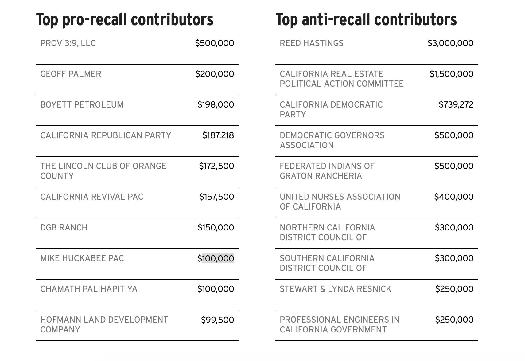 Unlike contributions to candidates, there are no limits on how much donors can give to the recall committees. Here are the top ten contributors to each side.