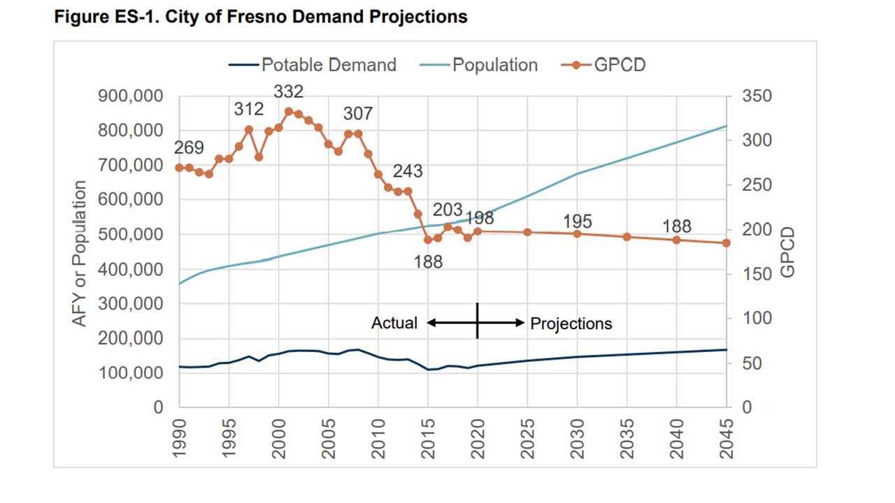 City officials say that water demand per person has decreased even as Fresno’s population has grown over the past several decades. And, although water demand will eventually grow as the population increases in the next 25 years, the city expects it will grow slowly.