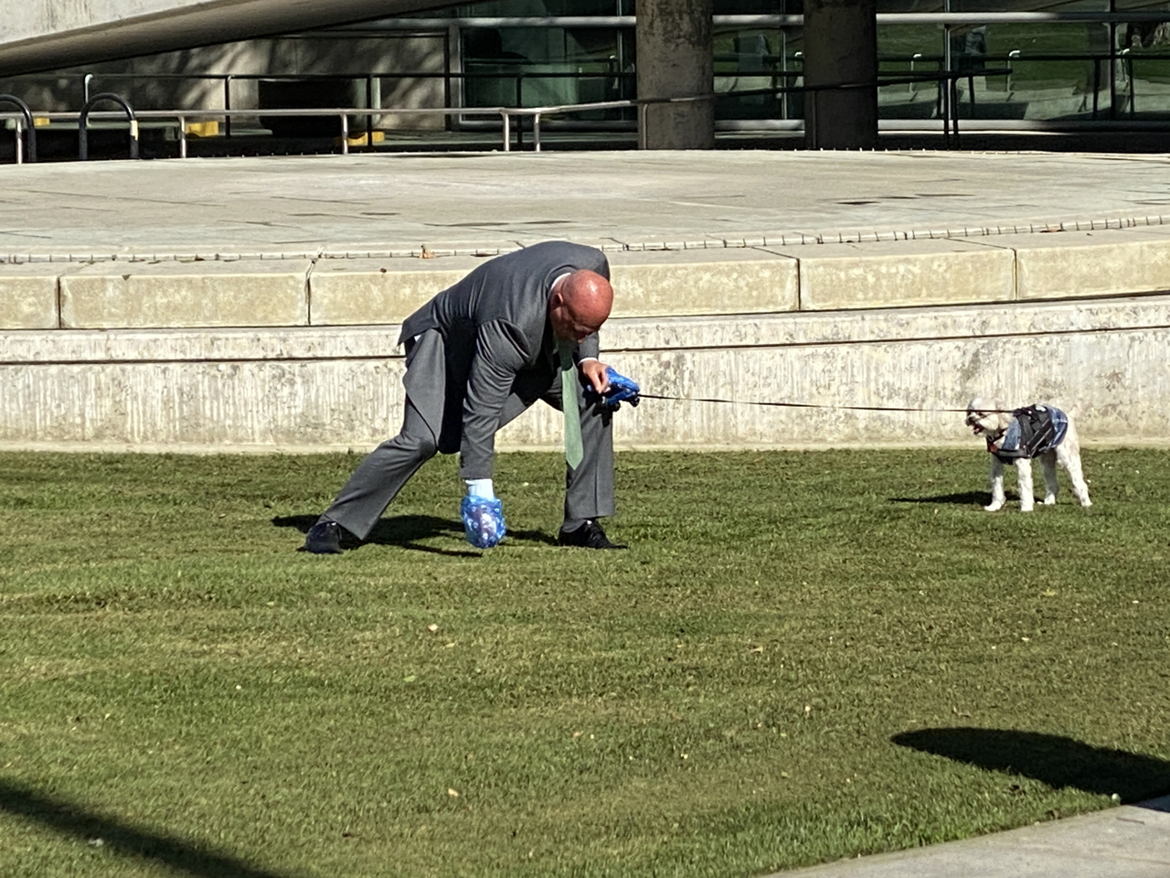 “(Stitch) sleeps with us every night and he has me trained as a pet owner. I bring him doggy bacon every single morning, seven days a week, and feed him in our bed, so he is truly part of the family,” Dyer said. Ever the responsible dog owner, Dyer cleaned up after Stitch on City Hall’s front lawn.