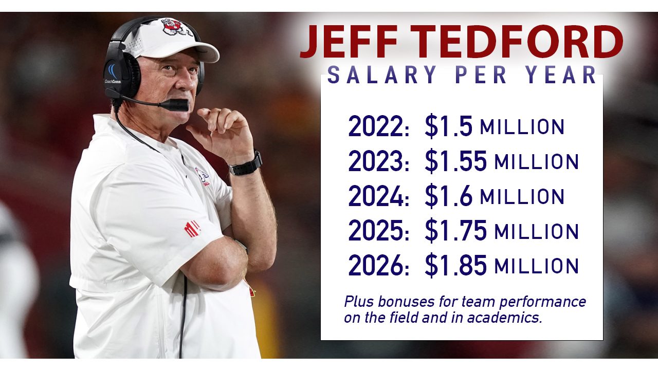 Tedford will earn $1.5 million for the 2022 season (the contract started Dec. 8, 2021) in base salary. That will escalate each season to $1.85 million for 2026.
