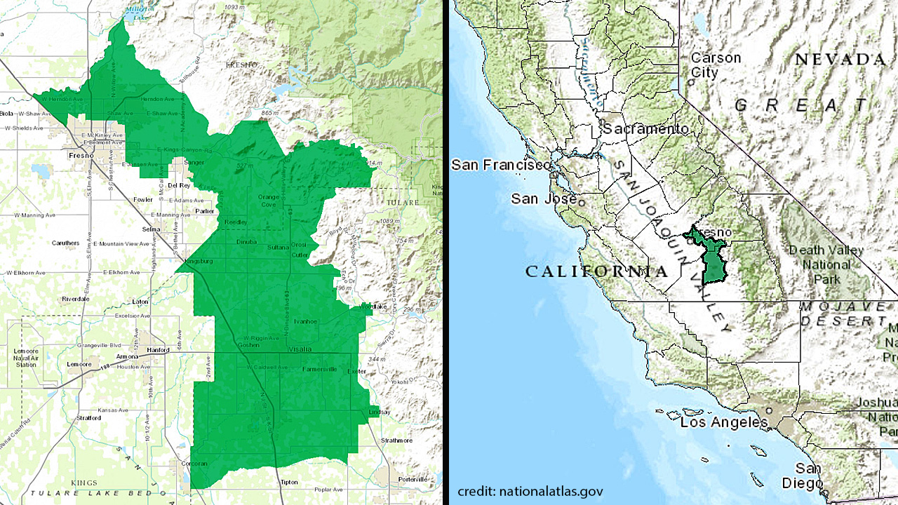 In the new lines, the 22nd district now covers parts of Kings, Tulare, and Kern counties. The overlapping area between the old and new 22 is composed of parts of the city of Tulare and surrounding areas.