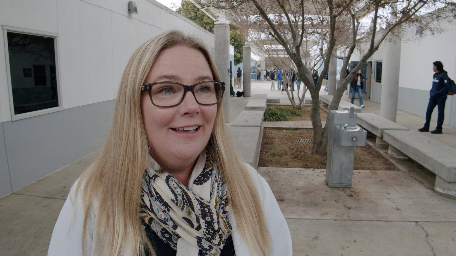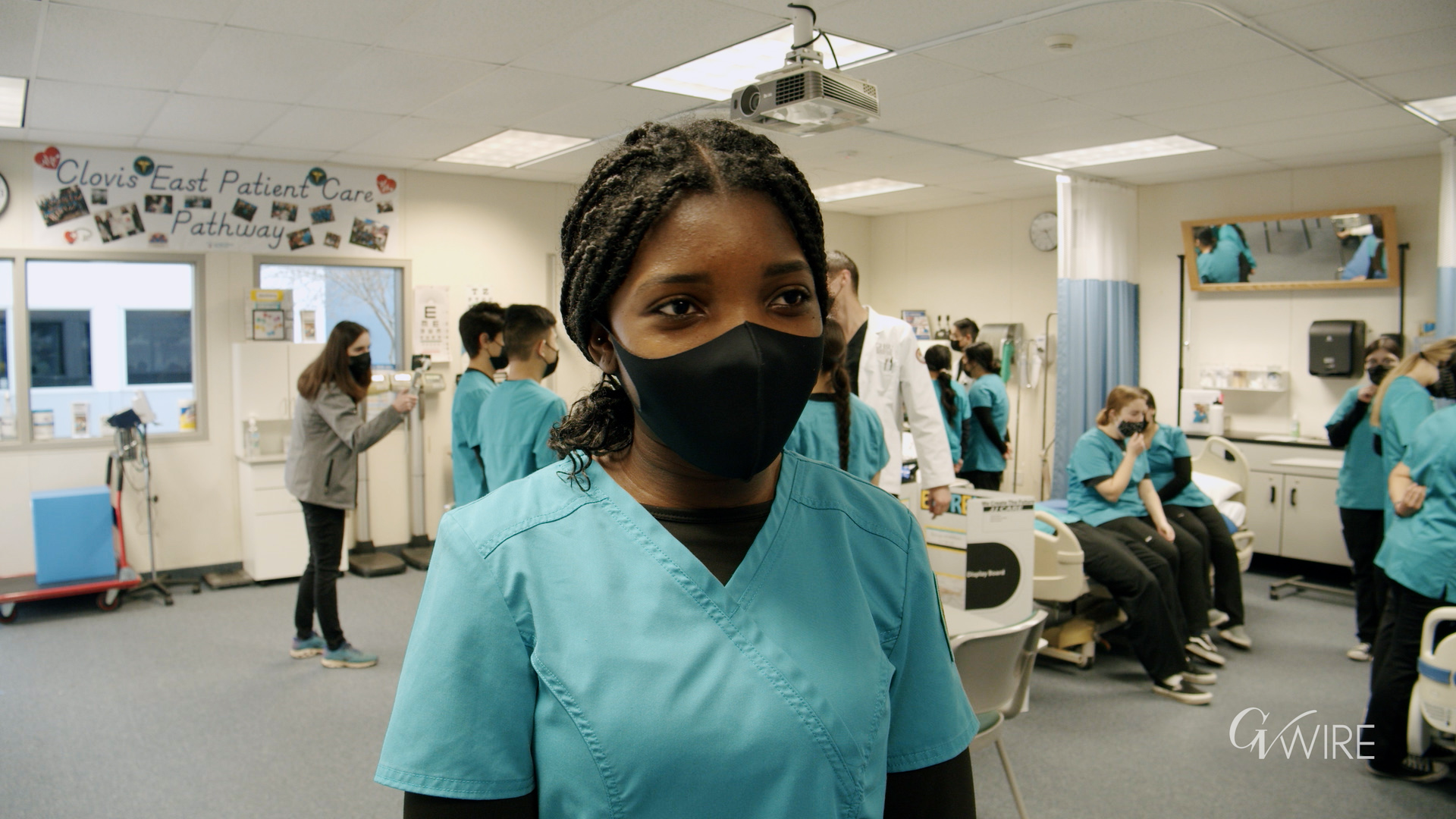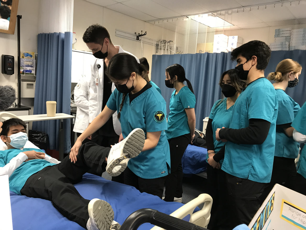 Two classrooms at Clovis East High School were crowded on Tuesday morning with students who are learning about medicine and healthcare. The ones in the white coats were medical students from California Health Sciences University in Clovis, while the younger ones in teal scrubs were the juniors in Dr. Kelly Eichmann’s patient care pathway program.