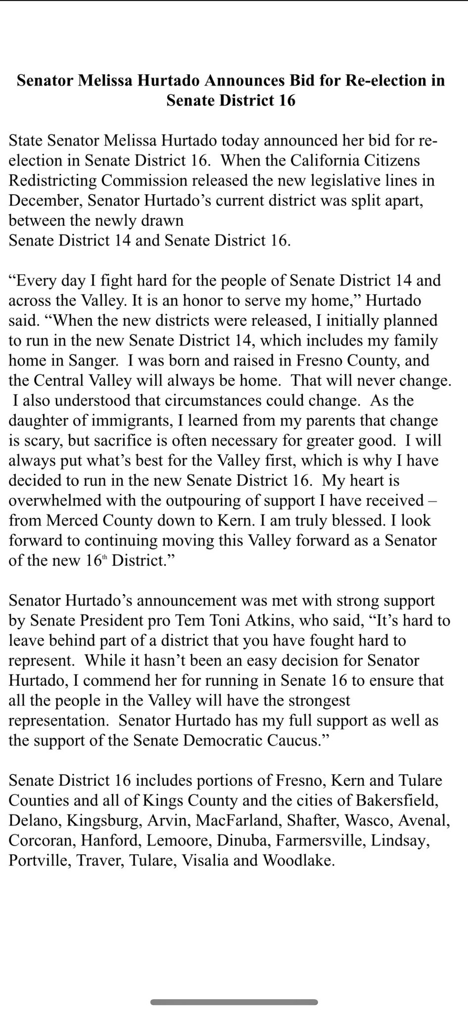 “When the new districts were released, I initially planned to run in the new Senate District 14, which includes my family home in Sanger,” Hurtado said in a text. “I also understood the circumstances could change. As the daughter of immigrants, I learned from my parents that change is scary, but sacrifice is often necessary for greater good. I will always put what’s best for the Valley first, which is why I have decided to run in the new Senate District 16.”