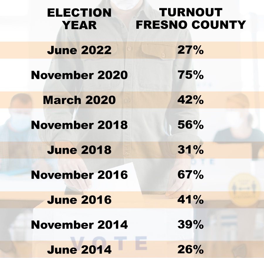 Voter turnout figures for Fresno County align with McCarty’s reasoning. Voting in presidential elections significantly outpaces non-presidential elections.