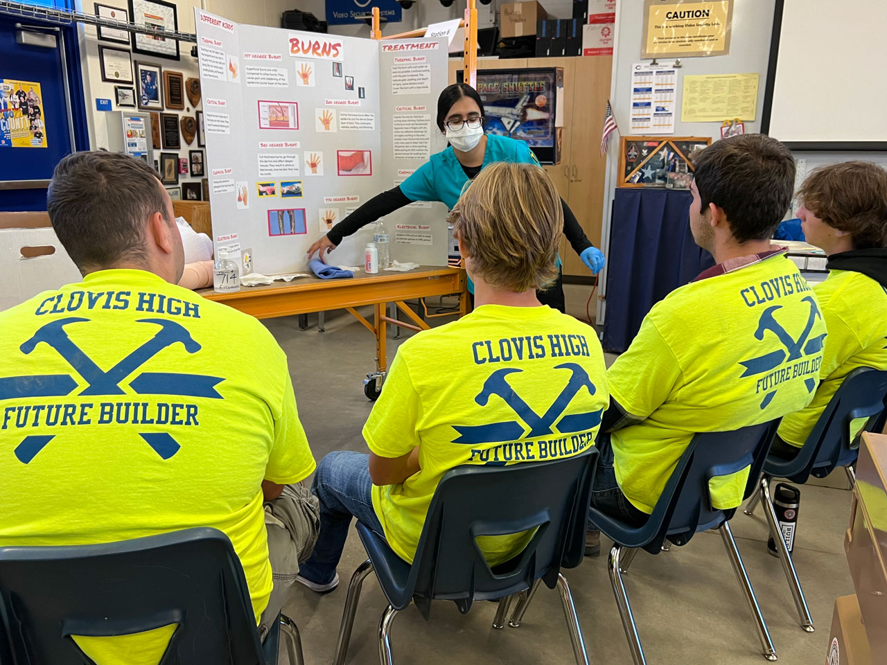The green-shirted construction students in Jay Eichmann’s career technical education classroom at Clovis High School listened intently as turquoise-jacketed instructors taught them how to treat burns, bandage impalements and broken bones, and deal with other injuries that can occur on a job site.