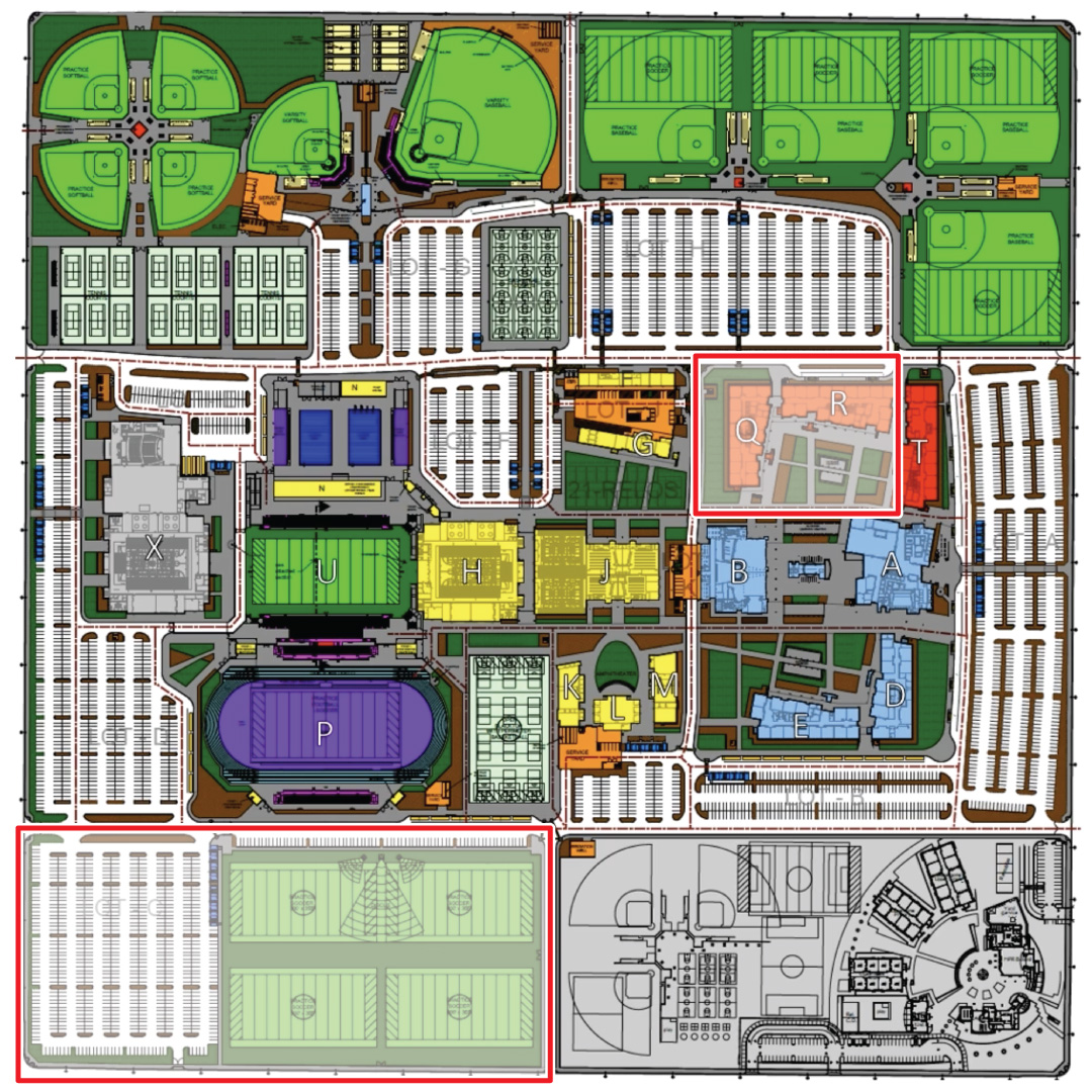 Those cuts include delaying the construction of two buildings, Q and R, that are part of the high school campus, as well as playing fields and a parking lot in the southwest portion of the campus and using less concrete in areas such as sports fields whenever possible, Stairs said.